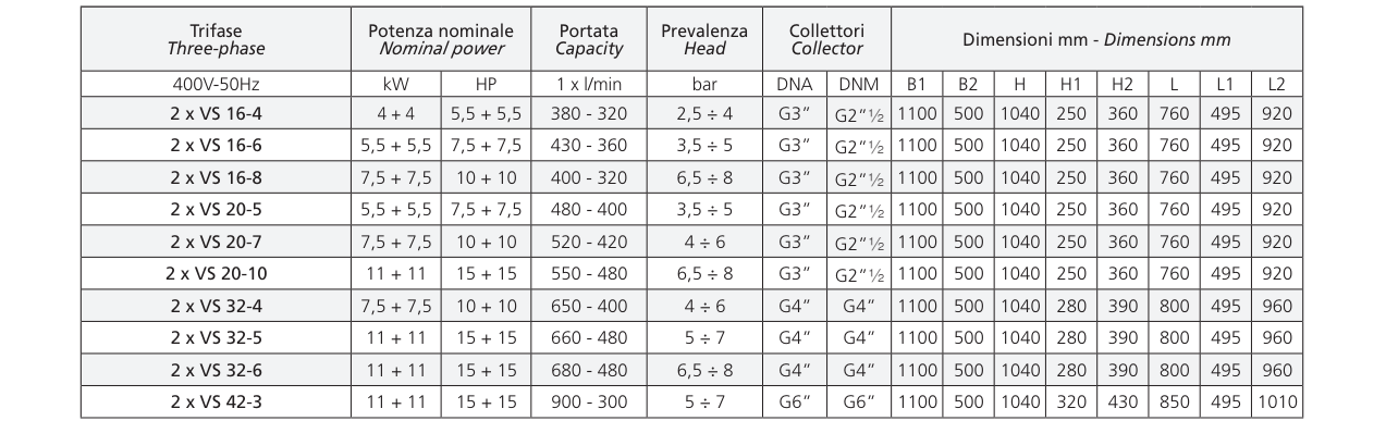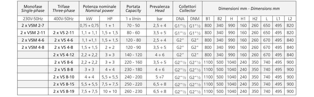 Hệ 2 bơm tăng áp ly tâm trục đứng đa tầng cánh Inox Speroni/Italia model VS là bộ phận áp suất với máy bơm bằng thép không gỉ nhiều tầng trục đứng hoàn chỉnh với đế có bộ giảm rung, ống hút và phân phối, van bi, van một chiều, có hoặc không có bể màng.