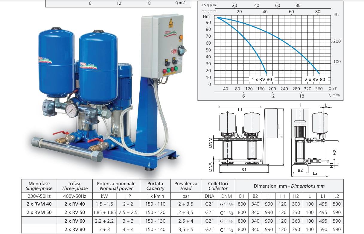Hệ 2 bơm tăng áp ly tâm trục đứng đa tầng cánh Speroni/Ý model RVM là bộ áp suất với 2 máy bơm trục đứng nhiều tầng hoàn chỉnh với đế có bộ giảm rung, ống góp hút và phân phối, van bi, van một chiều, có hoặc không có 2 bể màng.