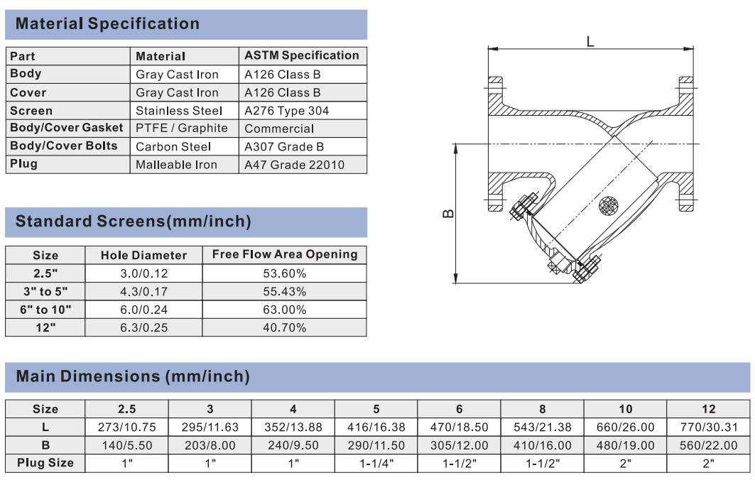 Y Lọc có thể được cài đặt ở vị trí ngang hoặc dọc (dòng chảy xuống) với tấm lưới lọc dốc xuống. Điều này cho phép bộ lọc thu thập vật liệu trong bộ lọc ở điểm thấp nhất của khoang chứa.