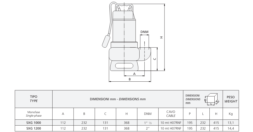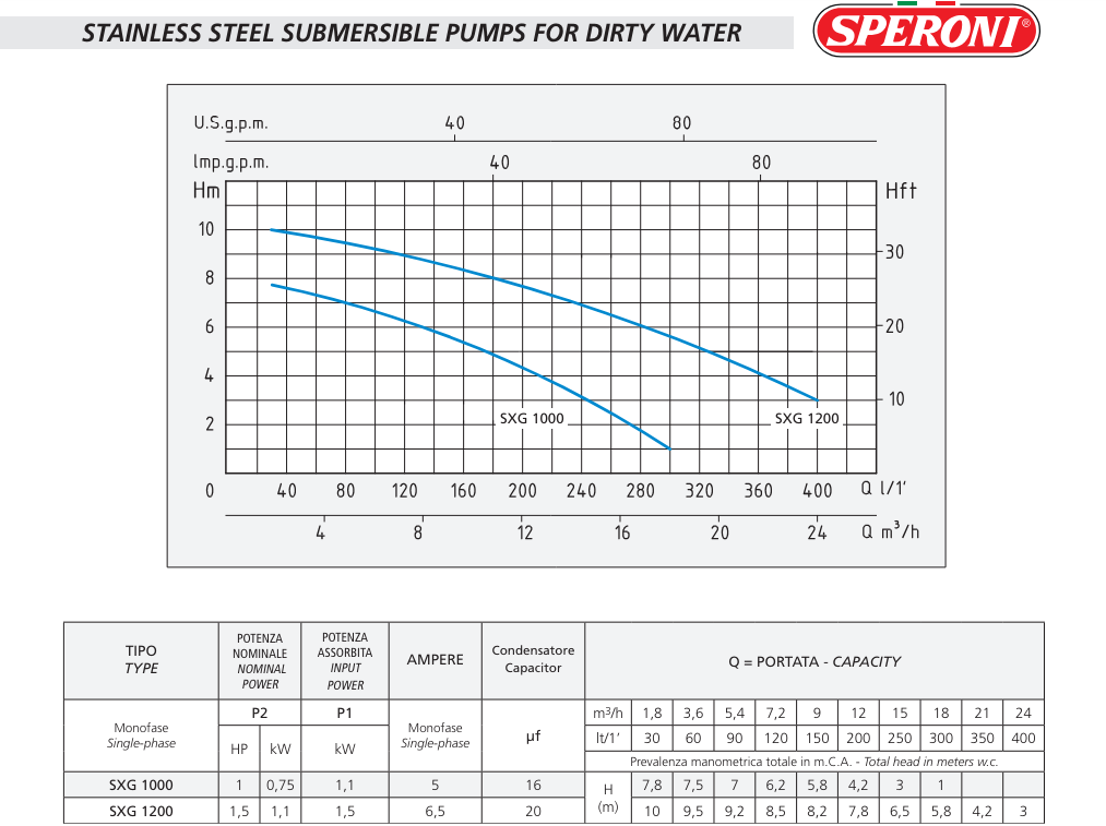 Máy bơm chìm nước thải Speroni/Italia model SXG 1000/1200 là máy bơm điện chìm bằng thép không gỉ để thoát nước với cánh quạt bằng thép không gỉ thích hợp để làm sạch các hố lắng và bơm nước thải cho mục đích sinh hoạt và dân dụng. Chúng cũng có thể được sử dụng cho nước có tính axit nhẹ.