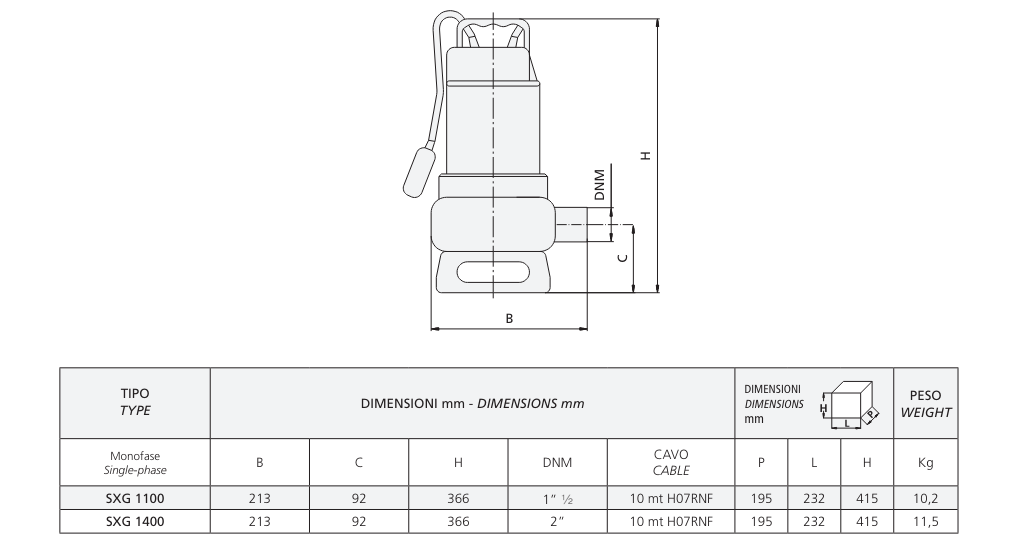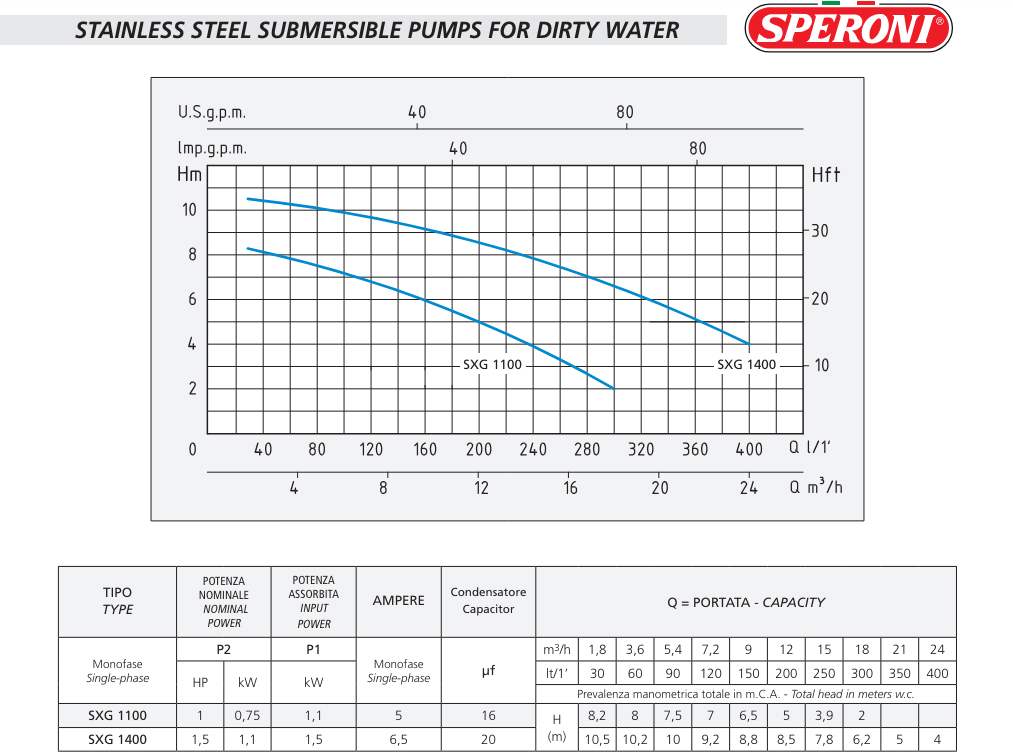 Máy bơm chìm nước thải Speroni/Italia model SXG 1100/1400 là máy bơm điện chìm bằng thép không gỉ để thoát nước với cánh quạt bằng thép không gỉ thích hợp để làm sạch các hố lắng và bơm nước thải cho mục đích sinh hoạt và dân dụng.