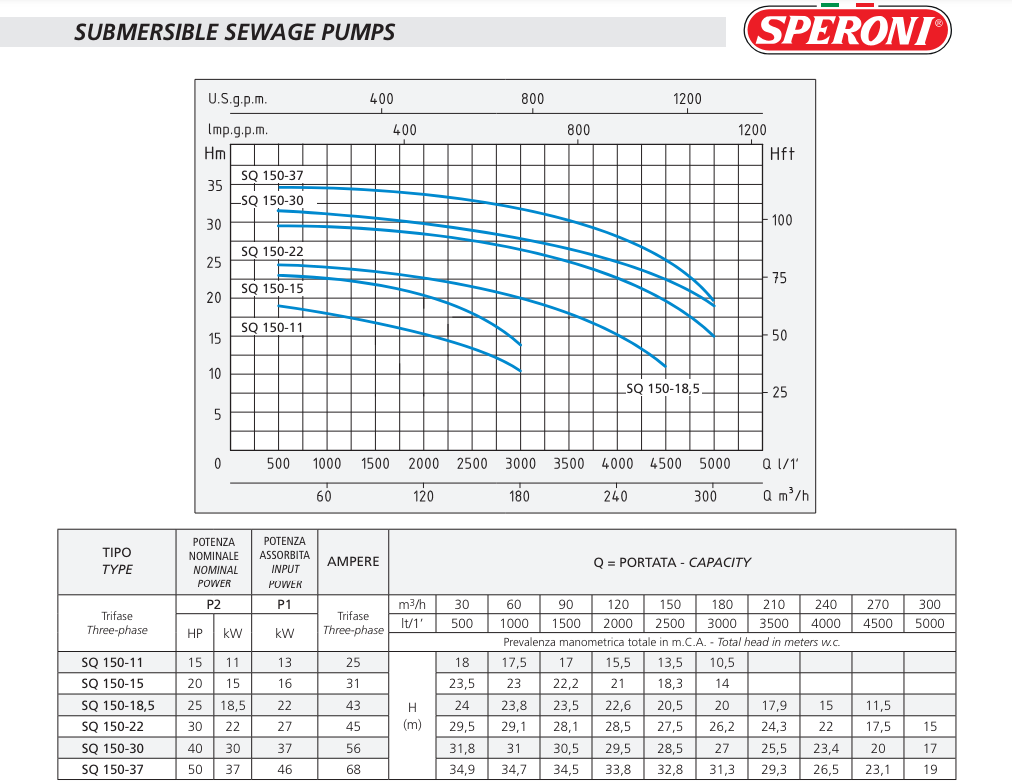Máy bơm chìm nước thải Speroni/Italia model SQ150 là máy bơm điện dòng SQ, nhờ có nhiều thiết bị được áp dụng, tạo thành giải pháp cho các vấn đề truyền tải nước công cộng, chất lỏng từ máy lọc, hệ thống xử lý nước thải, trang trại chăn nuôi, lò mổ và nhà máy sản xuất đồ ăn nhanh, xưởng đúc và khu vực nông nghiệp. thủy lợi. Áp dụng trong ngành công nghiệp đánh cá và giấy, trong các hệ thống dân dụng dân dụng, tiếp xúc với bùn công nghiệp có mật độ thấp hoặc trung bình. Máy bơm điện có cánh quạt đơn kênh mở mang lại lượng đường đi tự do lớn và hiệu quả tuyệt vời.