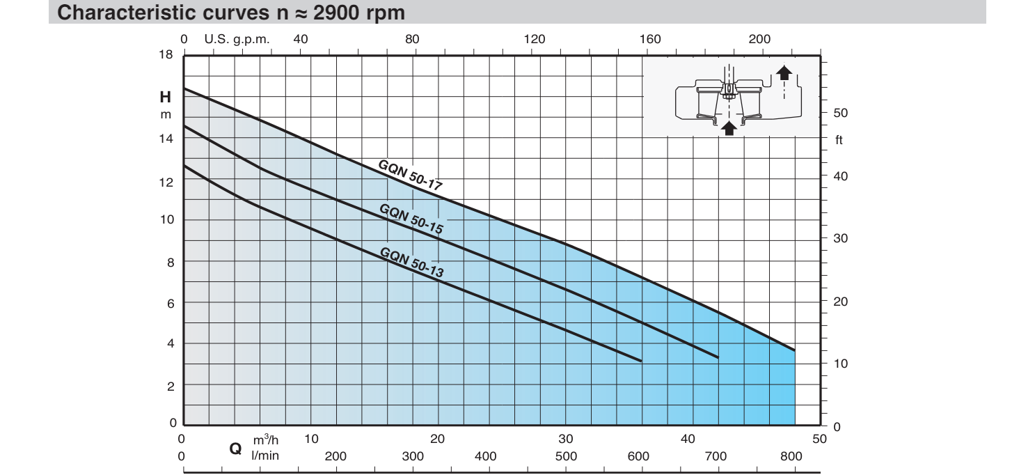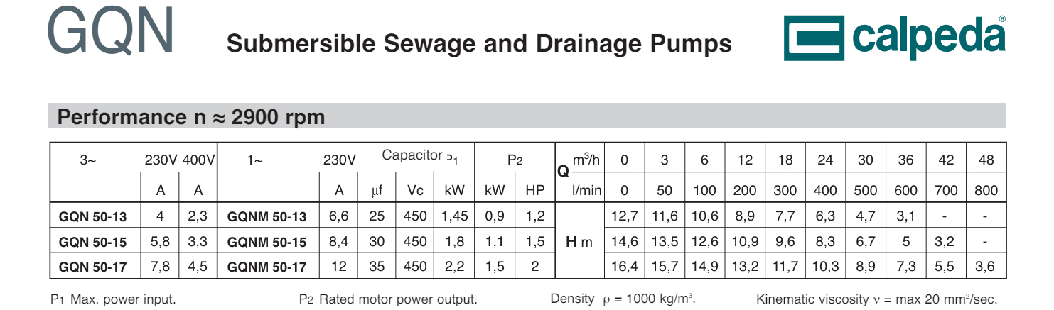 Máy bơm chìm nước thải và thoát nước Calpeda/Italia model GQN là máy bơm chìm một cánh quạt, (có hai lối đi) với các kênh cánh quạt có cổng phân phối ren dọc (G 2”). Phốt trục cơ khí kép có buồng dầu xen kẽ, để bảo vệ chống chạy khô.