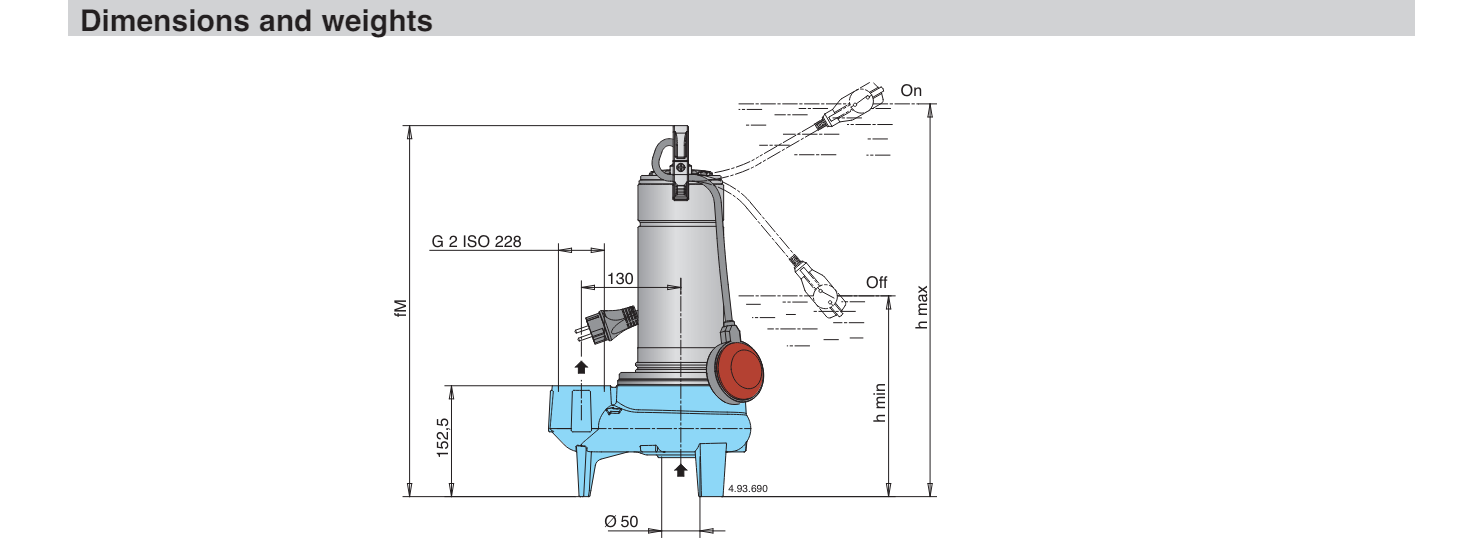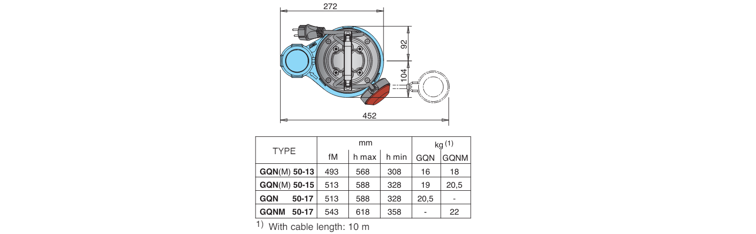 GQNM: một pha 230 V ± 10%, có công tắc phao và bộ bảo vệ nhiệt. Tụ điện tích hợp. Cáp: H07RN-F, 3G1 mm2, dài 10 m, có đầu cắm CEI-UNEL 47166.
