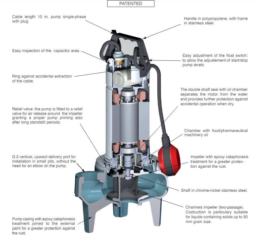- Dùng cho nước thải sinh hoạt hoặc công nghiệp, nước bẩn có chất rắn cỡ hạt lên tới 50 mm, dùng cho chất lỏng tương thích với vật liệu bơm.