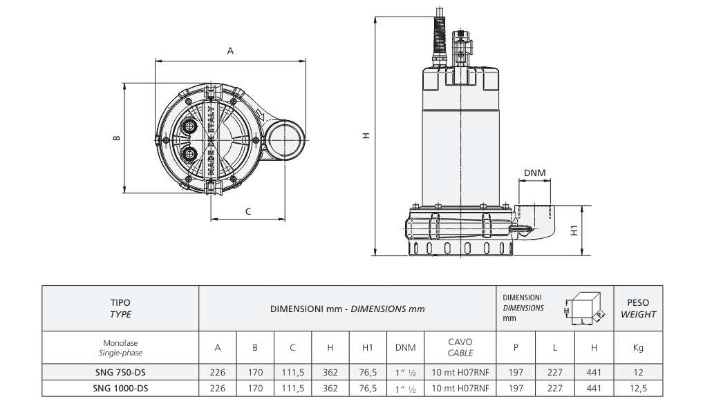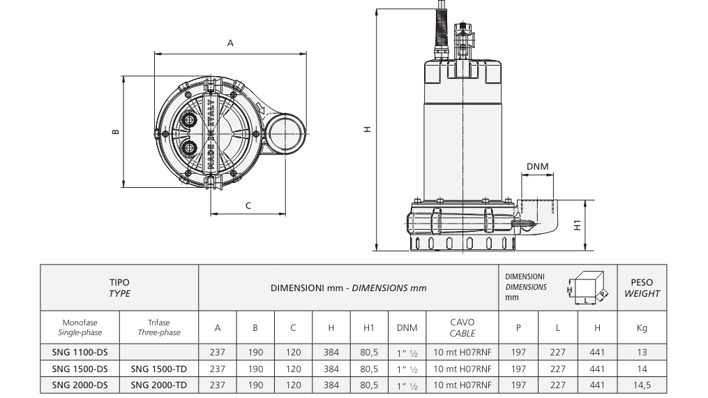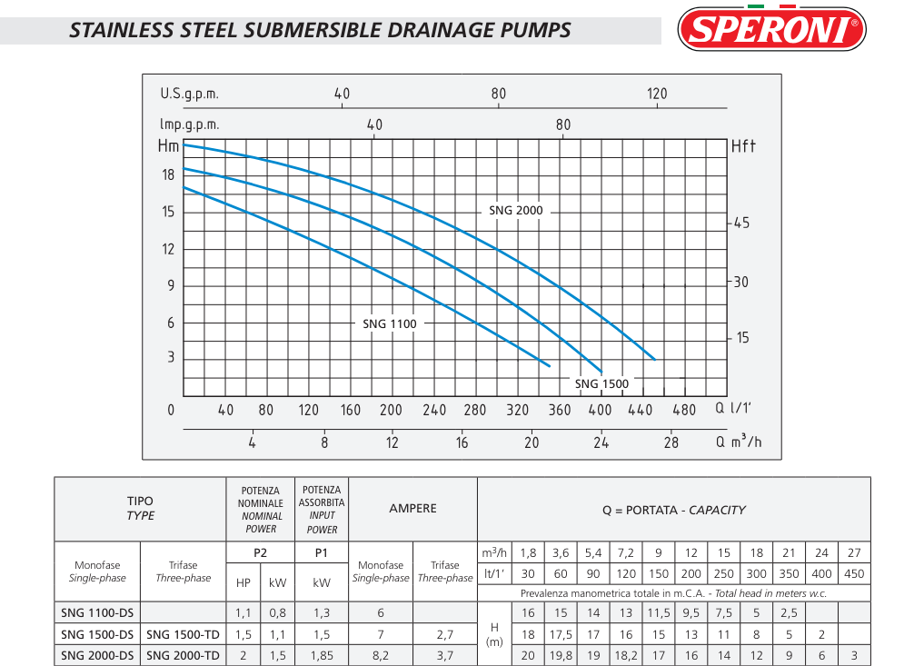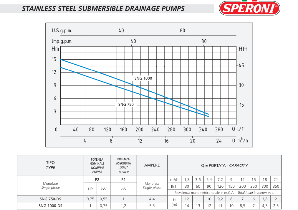 Máy bơm chìm thoát nước bằng thép không gỉ Speroni/Ý model SNG-D là máy bơm điện chìm bằng thép không gỉ di động được vận hành tự động. Dùng để thoát nước thấm, thông phòng hoặc bể ngập nước, thoát nước thải sạch hoặc hơi bẩn, tưới các luống rau, vườn.