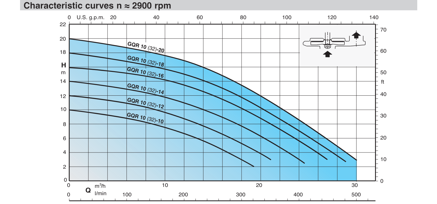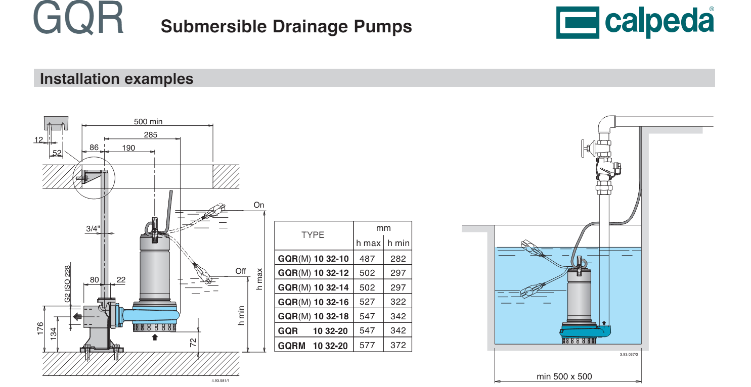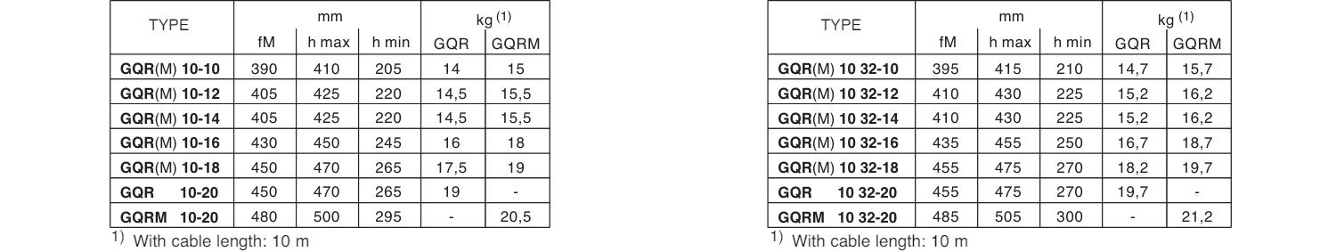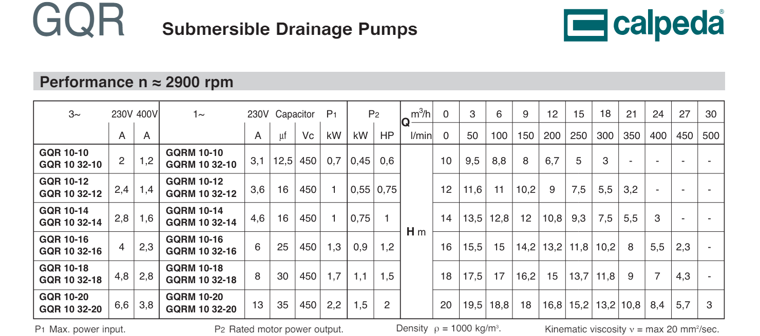 GQRM: một pha 230 V ± 10%, có công tắc phao và bộ bảo vệ nhiệt. Tụ điện tích hợp. Cáp: H07RN-F, 3G1 mm2, dài 10 m, có đầu cắm CEI-UNEL 47166.