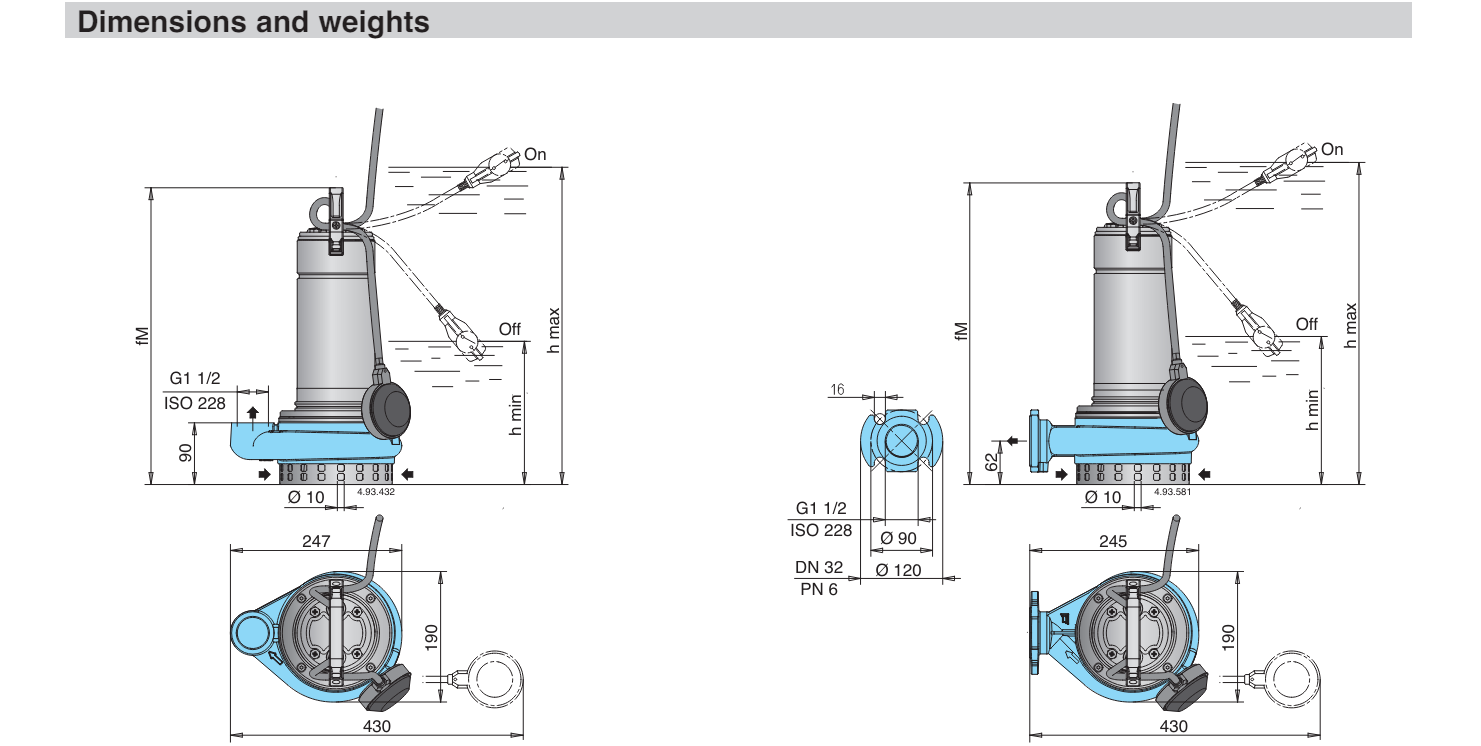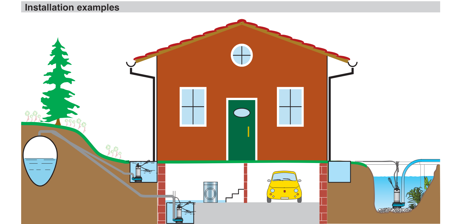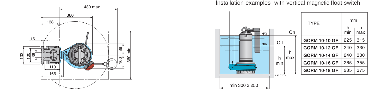 GQRM: một pha 230 V ± 10%, có công tắc phao và bộ bảo vệ nhiệt. Tụ điện tích hợp. Cáp: H07RN-F, 3G1 mm2, dài 10 m, có đầu cắm CEI-UNEL 47166.