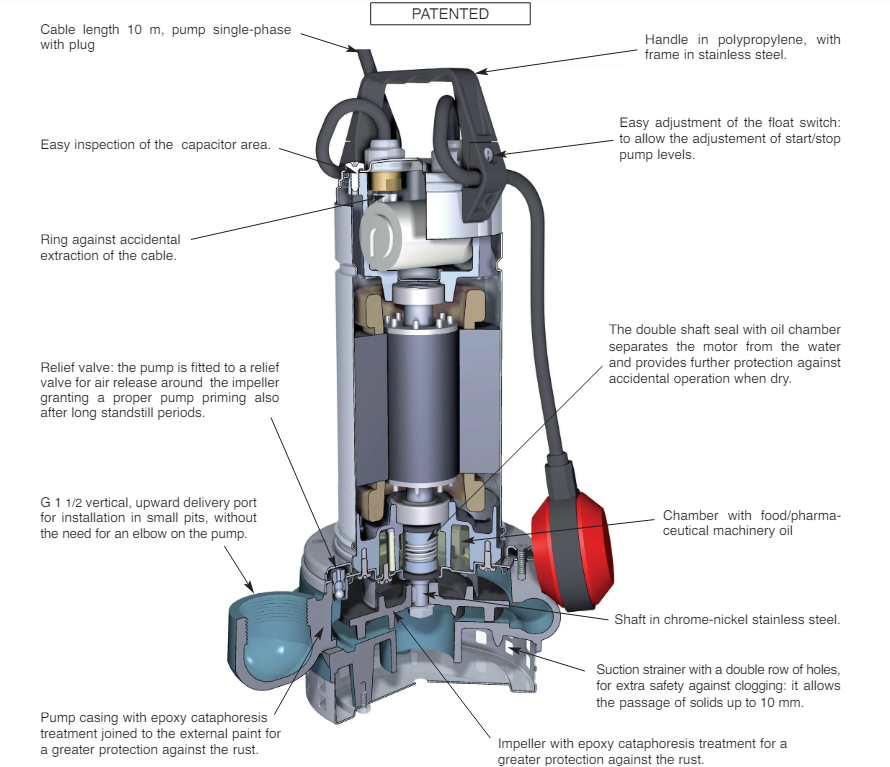 Máy bơm chìm thoát nước Calpeda/Italia model GQR là dòng máy bơm thoát nước chìm một cánh, có cánh hở.