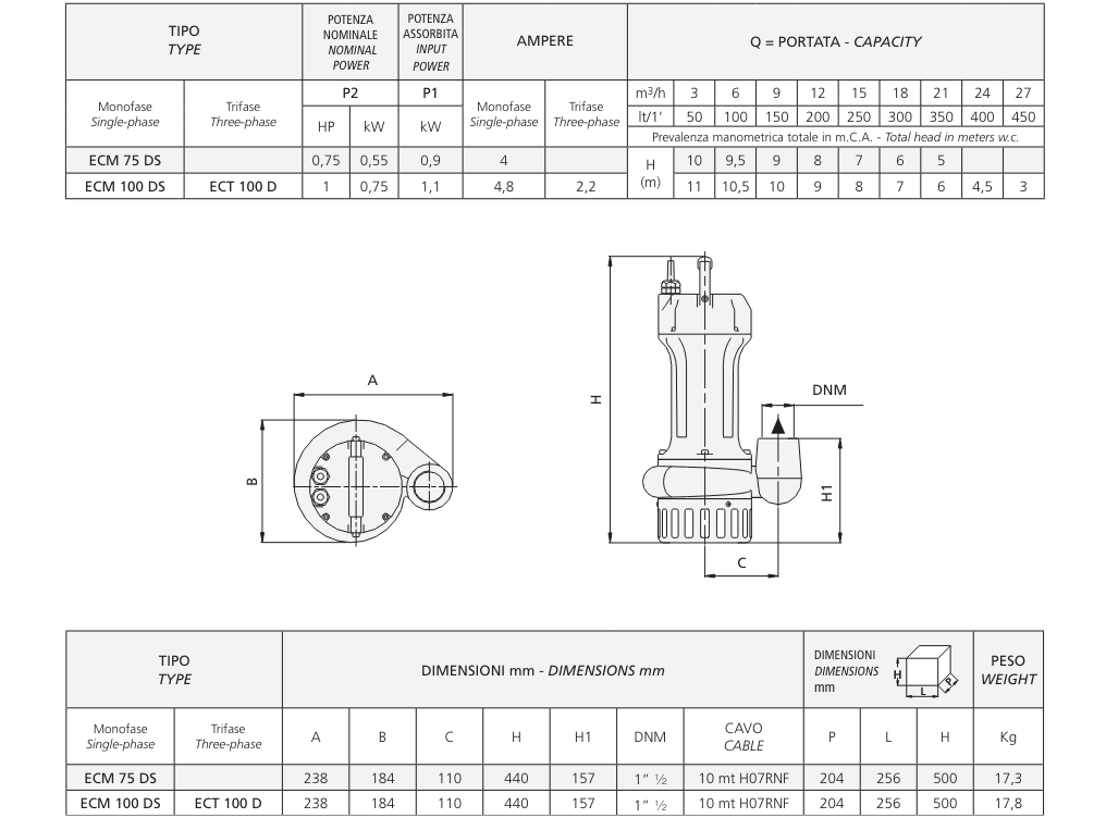 Catalog Máy bơm điện chìm thoát nước cánh hở Speroni/Ý model ECM-D