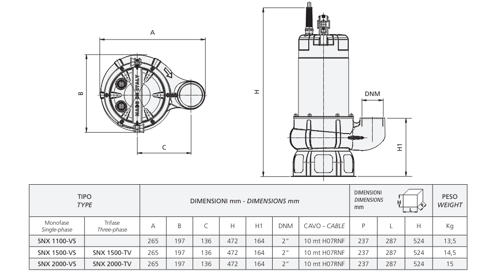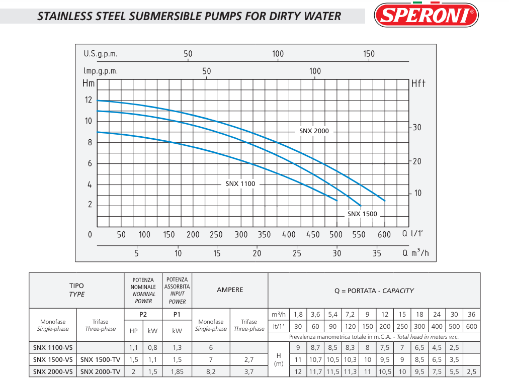 Catalog Máy bơm chìm thoát nước cánh Vortex Speroni/Ý model SNX-V
