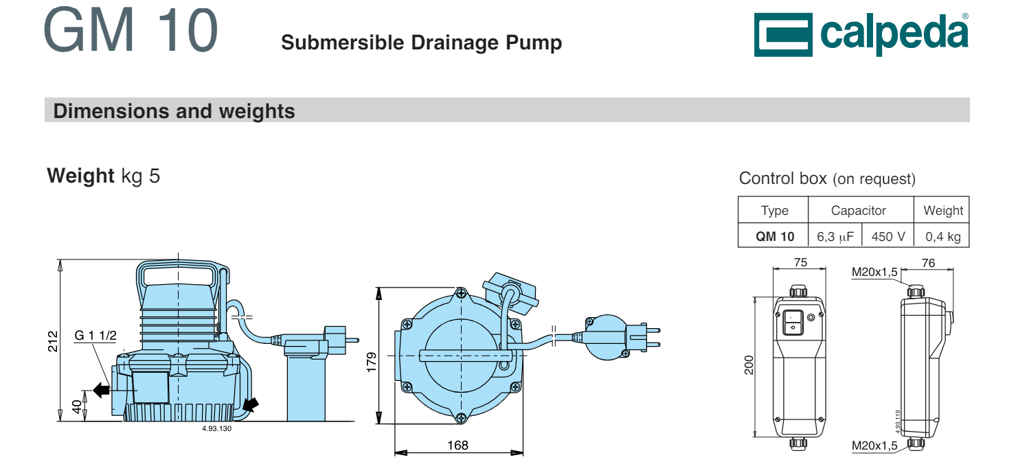 Máy bơm chìm thoát nước Calpeda/Italia model GM10 là máy bơm thoát nước chìm được chế tạo bằng polyme tổng hợp được phát triển đặc biệt cho sản phẩm này.