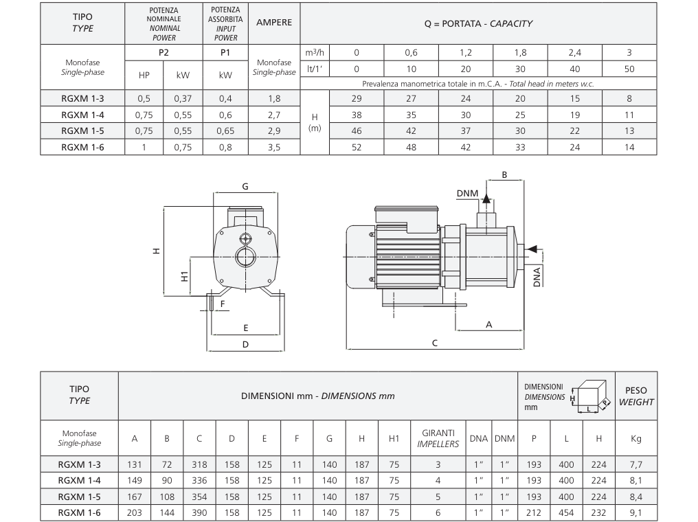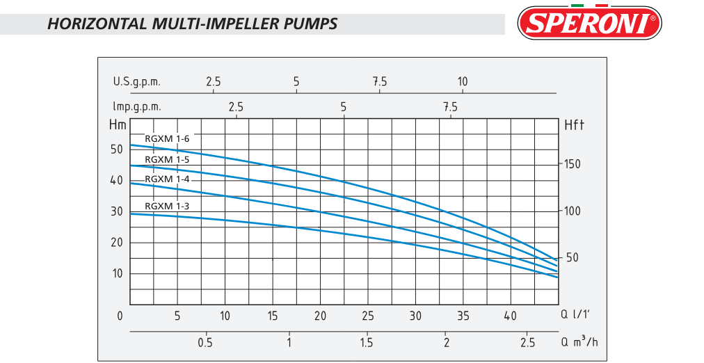 Máy bơm ly tâm trục ngang đa tầng cánh Speroni/Ý model RGXM1 là Máy bơm điện nhiều cánh quạt trục ngang phát triển áp suất đáng kể, đồng thời tốc độ dòng nước cao với mức tiêu thụ năng lượng thấp. Do khả năng hoạt động êm ái và đặc tính thủy lực tuyệt vời, chúng được sử dụng trong các hệ thống gia dụng, tưới phun mưa nhỏ, rửa xe và lắp ráp các nhóm áp suất (nồi hấp).