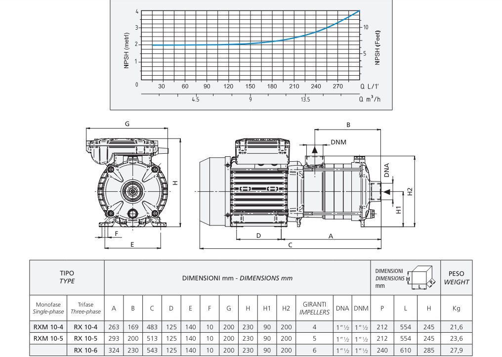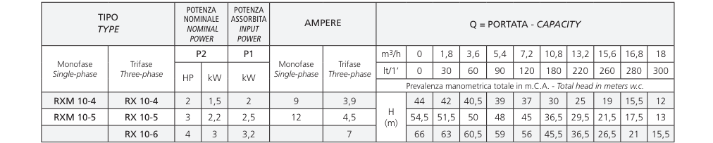 Máy bơm ly tâm trục ngang đa tầng cánh RXM10 là Máy bơm điện nhiều cánh quạt trục ngang phát triển áp suất đáng kể, đồng thời tốc độ dòng nước cao với mức tiêu thụ năng lượng thấp. Do khả năng hoạt động êm ái và đặc tính thủy lực tuyệt vời, chúng được sử dụng trong các hệ thống gia dụng, tưới phun mưa nhỏ, rửa xe và lắp ráp các nhóm áp suất (nồi hấp). Đặc biệt thích hợp cho các hệ thống tự động được điều khiển bằng bộ điều chỉnh lưu lượng hoặc bộ biến tần.