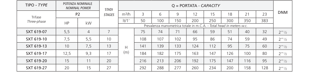 Máy bơm giếng chìm đa tầng cánh Speroni/Italia model SXT 619 là máy bơm điện chìm nhiều tầng dành cho giếng sâu 6" (DN 150 mm). Đặc biệt thích hợp cho các ứng dụng dân dụng và công nghiệp, nguồn cung cấp tia nước và đài phun nước, hệ thống phòng cháy, thủy lợi nói chung và cung cấp nước sạch.