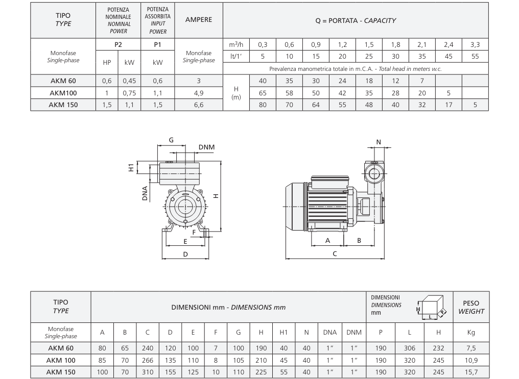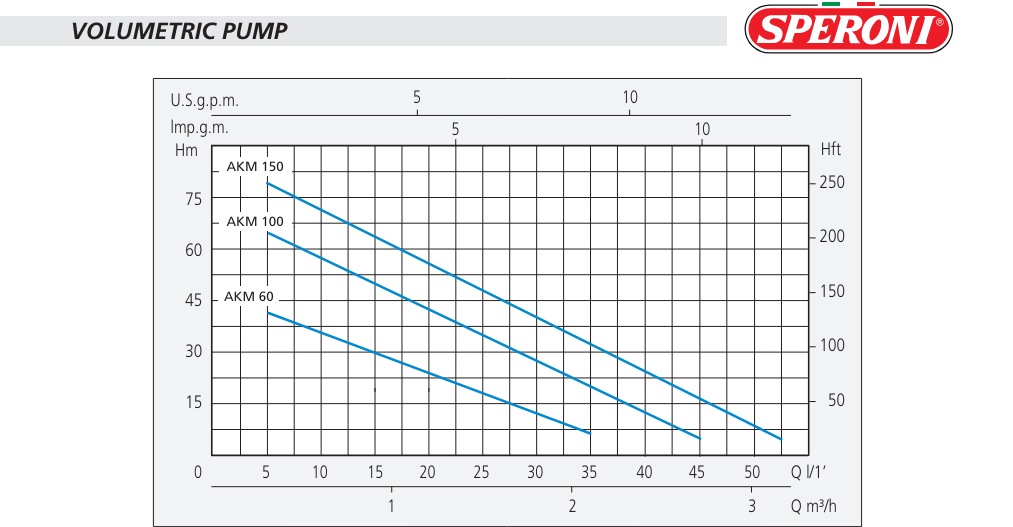 Máy bơm lưu lượng Speroni/Italia model AKM là máy bơm điện thể tích tự mồi có khả năng phát triển cột nước cao với công suất hạn chế và có đường cong vận hành đặc biệt ổn định. Lý tưởng cho các hệ thống sinh hoạt, để tăng áp lực mạng lưới cống dẫn nước và phân phối nước tự động bằng các bể nhỏ, nồi hấp hoặc nhóm thủy quyển màng. Để máy bơm hoạt động bình thường, chỉ sử dụng nước sạch hoặc chất lỏng không mạnh, không có cát hoặc các tạp chất rắn khác