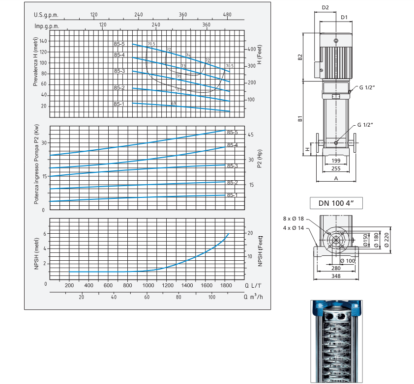 Máy bơm ly tâm trục đứng đa tầng cánh Speroni/Ý model VS85 là máy bơm điện đa năng dùng cho các ứng dụng dân dụng và công nghiệp, cho hệ thống rửa áp lực cao, tưới tiêu, nông nghiệp, thể thao, cho đài phun nước và chuyển động của chất lỏng có tính ăn mòn vừa phải mà không có chất rắn hoặc mài mòn.