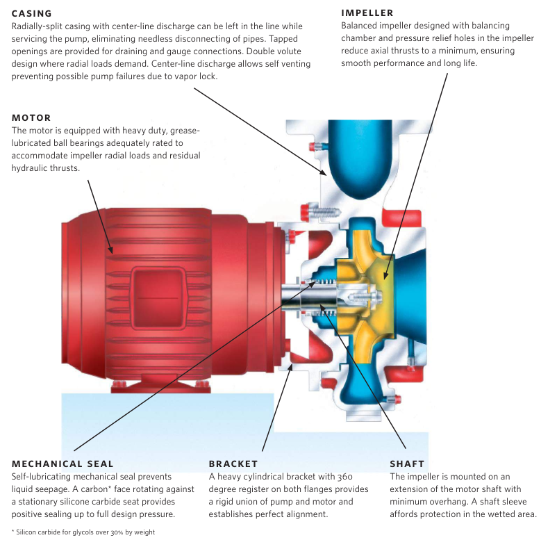 - Vỏ phân chia theo hướng tâm có thể được để lại trong đường dây trong khi bảo trì máy bơm, loại bỏ việc ngắt kết nối đường ống không cần thiết. Đã khai thác các lỗ được cung cấp cho các kết nối thoát nước và đo. xoắn ốc đôi thiết kế nơi yêu cầu tải trọng xuyên tâm. Xả dòng trung tâm cho phép tự thông hơi ngăn ngừa sự cố máy bơm có thể xảy ra do khóa hơi.