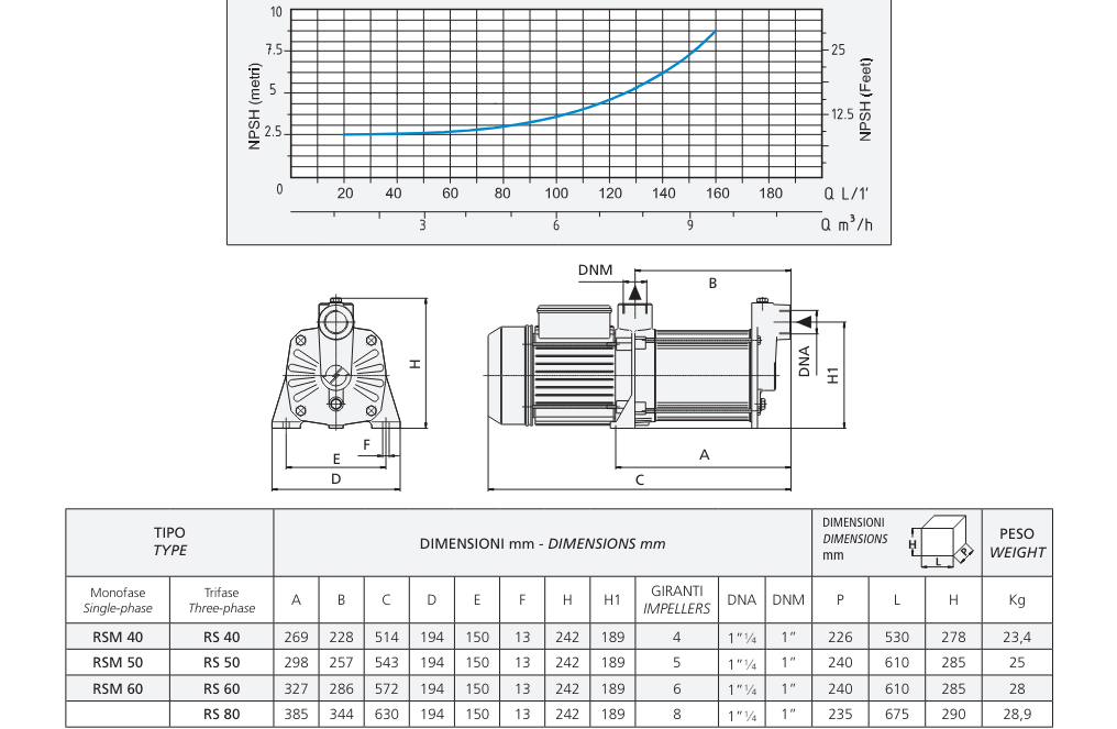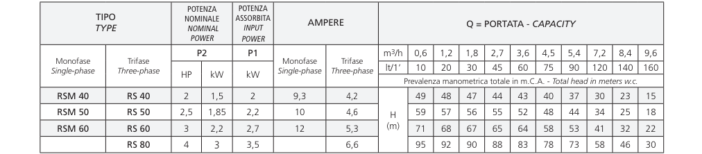 Máy bơm ly tâm trục ngang đa tầng cánh RSM 40/80 là Máy bơm ly tâm đa cánh quạt trục ngang phát triển áp suất đáng kể, đồng thời có tốc độ dòng nước cao với mức tiêu thụ năng lượng thấp. Do khả năng hoạt động êm ái và đặc tính thủy lực tuyệt vời, chúng được sử dụng trong các hệ thống gia dụng, tưới phun mưa nhỏ, rửa xe và lắp ráp các nhóm áp suất (nồi hấp).