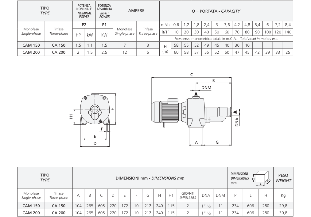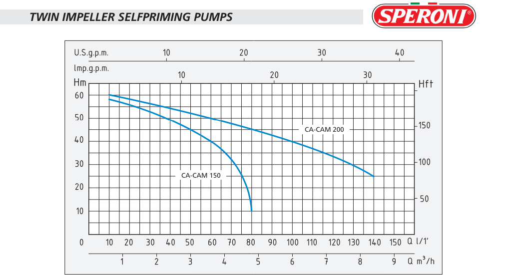 Máy bơm tự mồi cánh quạt đôi Speroni/Ý model CAM 150/200 là máy bơm điện tự mồi cánh quạt đôi có đầu phun, thích hợp cho lực hút lên đến 9m. Bằng cách tháo rời đầu phun ra khỏi thân máy bơm và kết nối nó với máy bơm thông qua một ống đôi cộng với van chân, nó cho phép hút lên tới 35 m. sâu. Thích hợp cho mục đích dân dụng và công nghiệp, để nâng nước sạch, nước pha khí và chất lỏng không ăn mòn hóa học cho các bộ phận máy bơm.