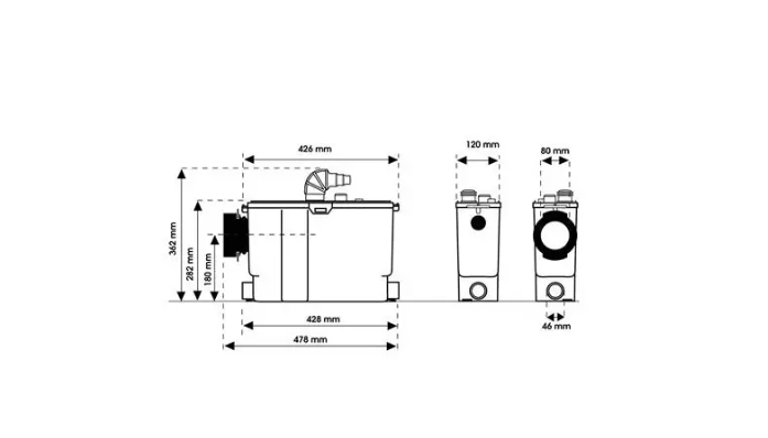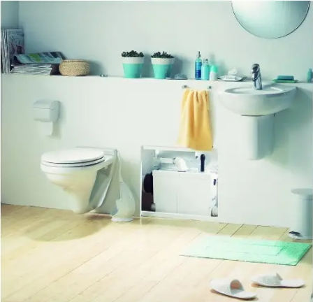 Với 3 cửa hút, Sanipack cho phép thoát nước thải từ bồn cầu treo tường, cũng như từ bồn rửa mặt và vòi hoa sen, thông qua một ống đường kính nhỏ.