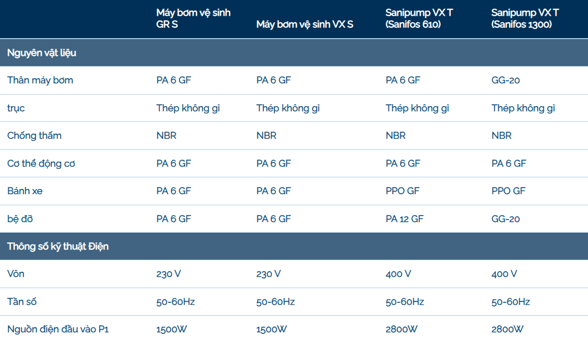 Sanipump GR và VX là máy bơm di động nhỏ gọn và nhẹ (chỉ 13 kg) dùng cho nước thải sinh hoạt như nhà vệ sinh, phòng tắm, nhà bếp hoặc phòng giặt, chấp nhận nước lên đến 70° C (tối đa 5 phút).