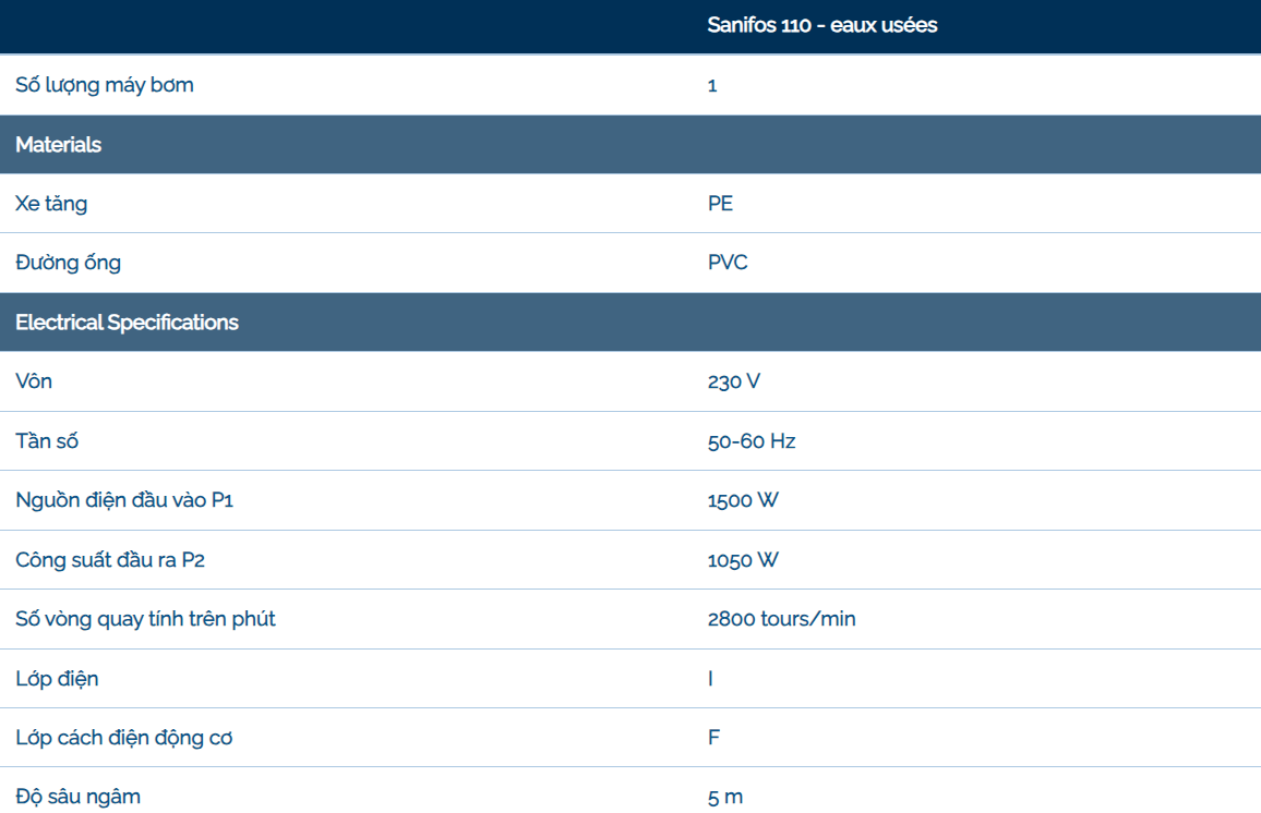 Sanifos 110 là trạm bơm ngầm nhỏ gọn dùng để bơm nước thải từ hộ gia đình: nhà vệ sinh, bồn rửa, máy giặt, v.v.