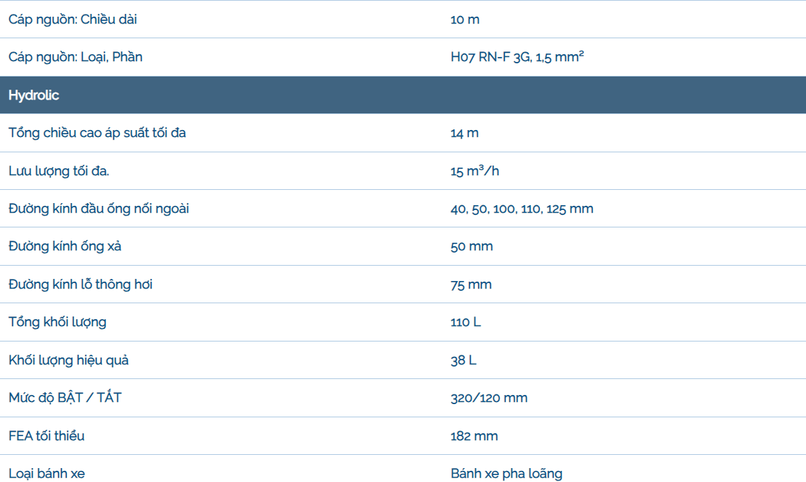Sanifos 110 bao gồm một máy bơm có công tắc phao để vận hành tự động, được cung cấp trang bị hệ thống thủy lực được lắp ráp sẵn và một miếng đệm cáp cho ổ cắm cáp động cơ.