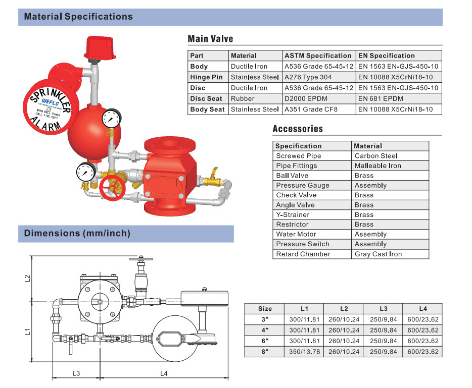 - Áp lực làm việc: UL/FM : 20 tới 300 psi, CE: 1.4 bar tới 16 bar