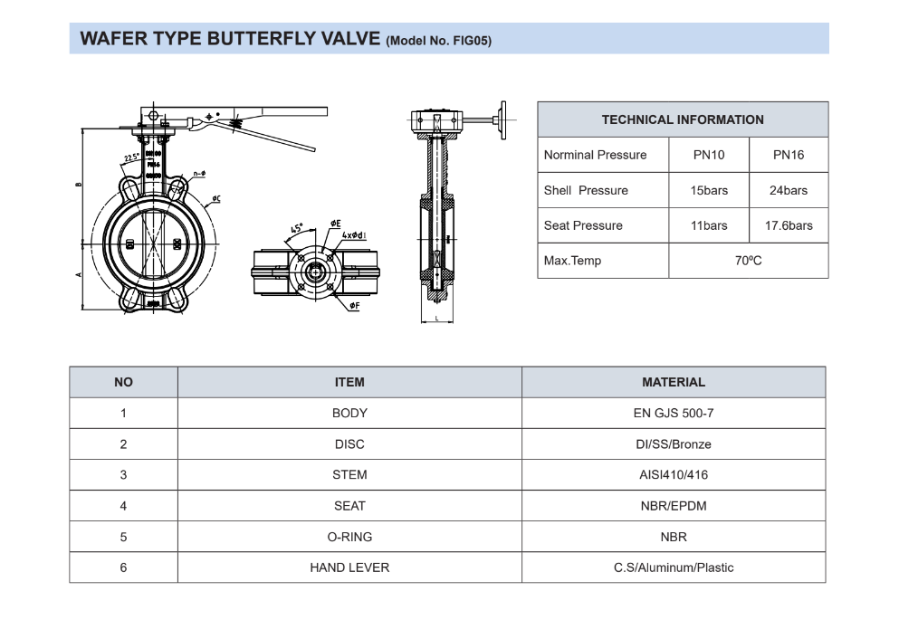 Van bướm tay gạt được cấu tạo gồm 05 bộ phận chính: thân van, vòng đệm, đĩa van, ty van và tay gạt.